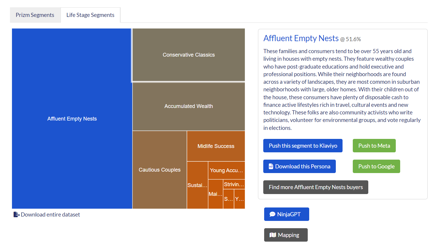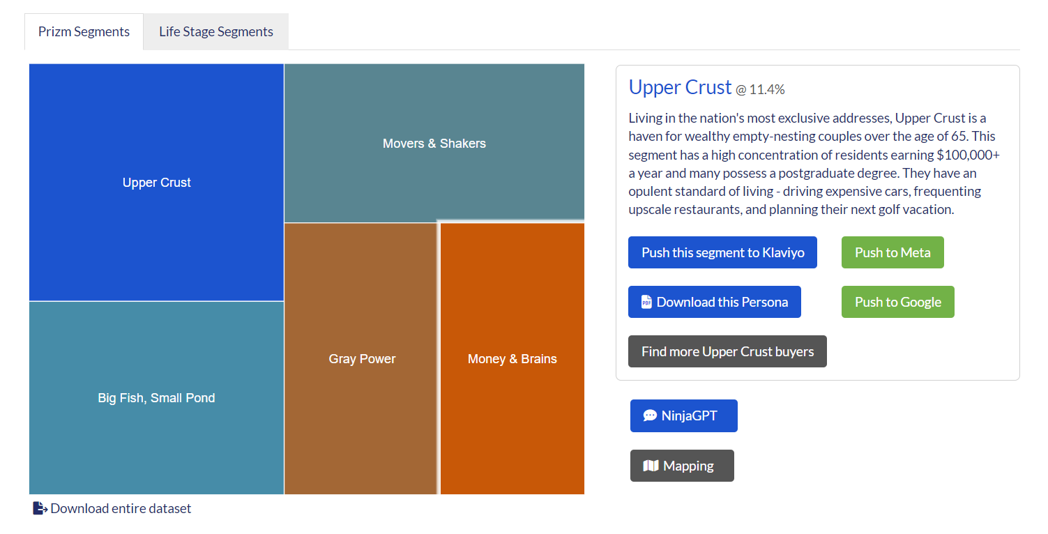 A visual representation in Segment Ninja showing the size and distribution of your customer database by Prizm and Lifestage segments, helping you identify dominant groups.